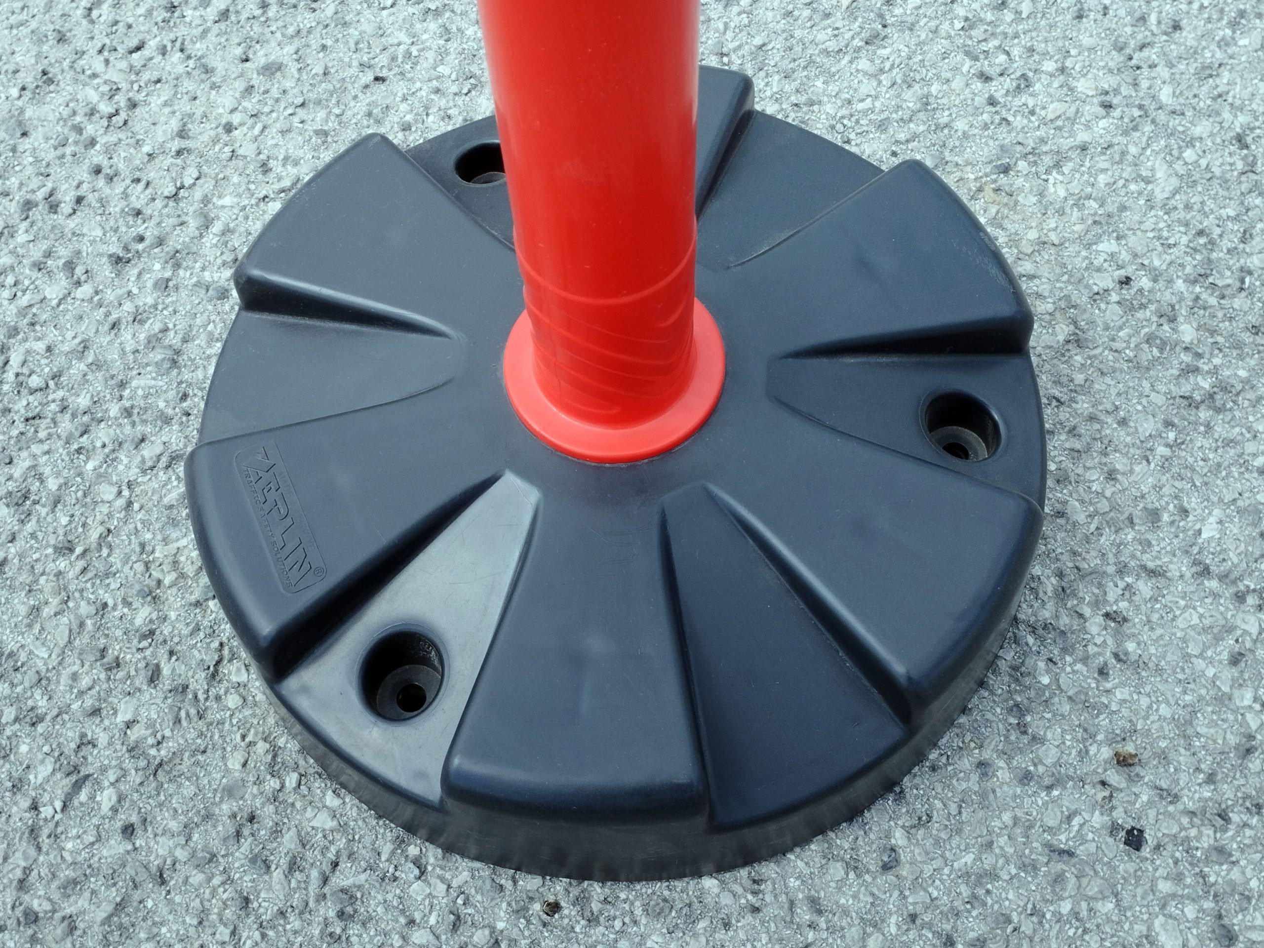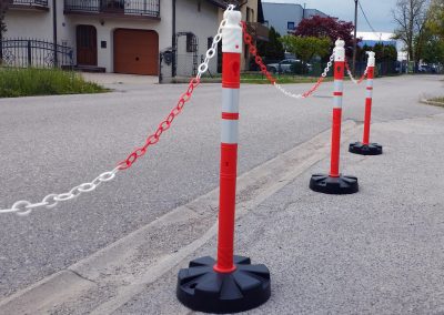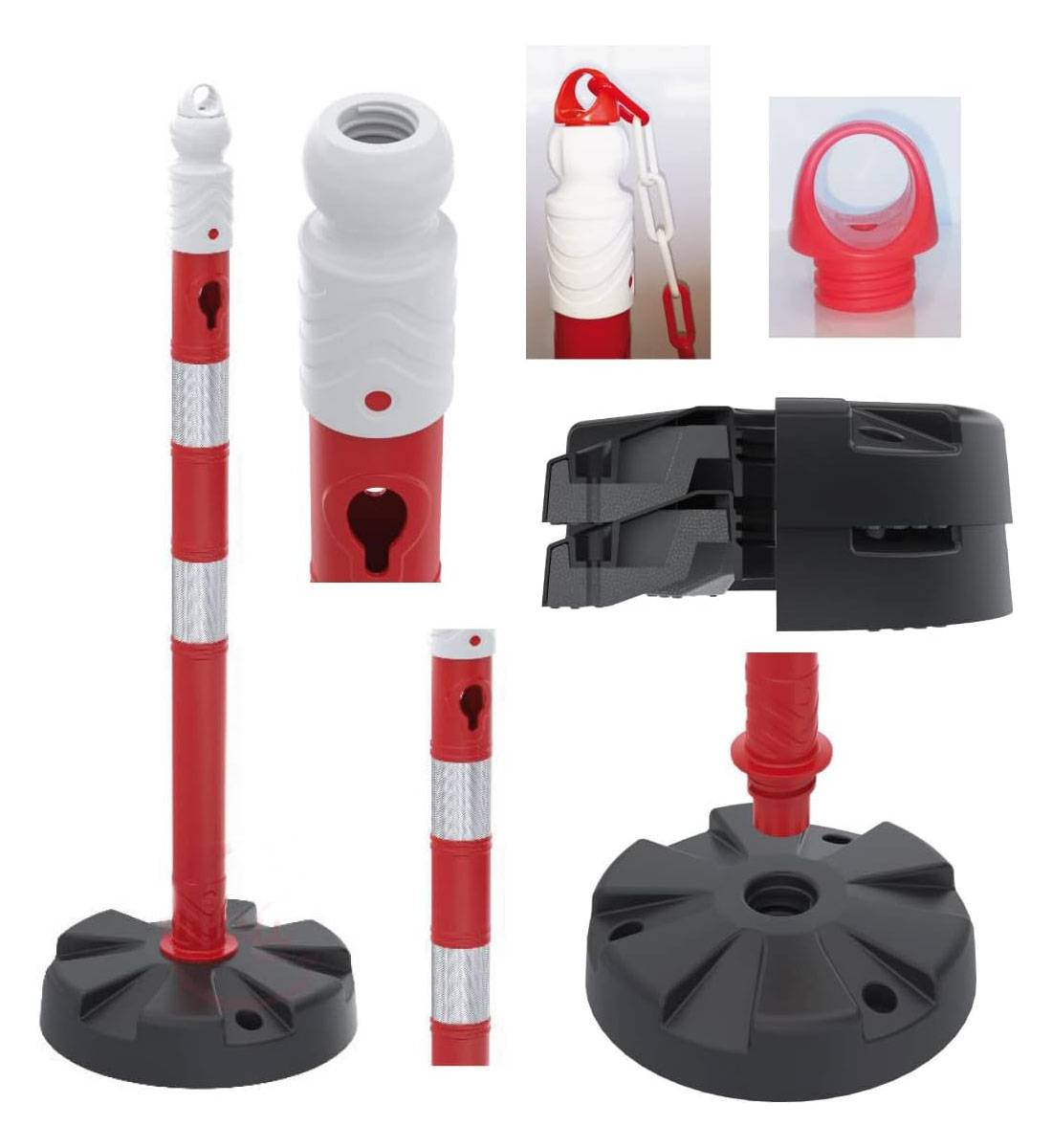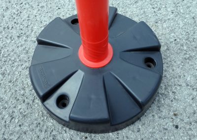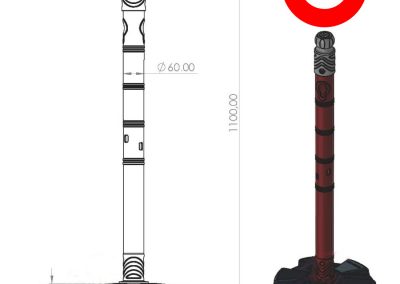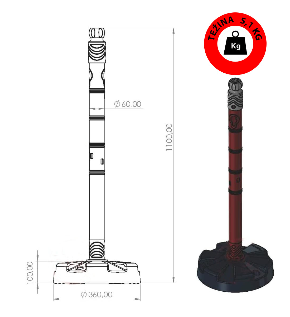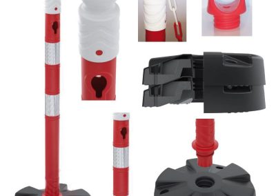 - Materijal i dizajn: Stupić je crveno-bijele boje s reflektirajućim prugama za bolju vidljivost, a stabilnost osigurava otežana baza težine 5 kg.